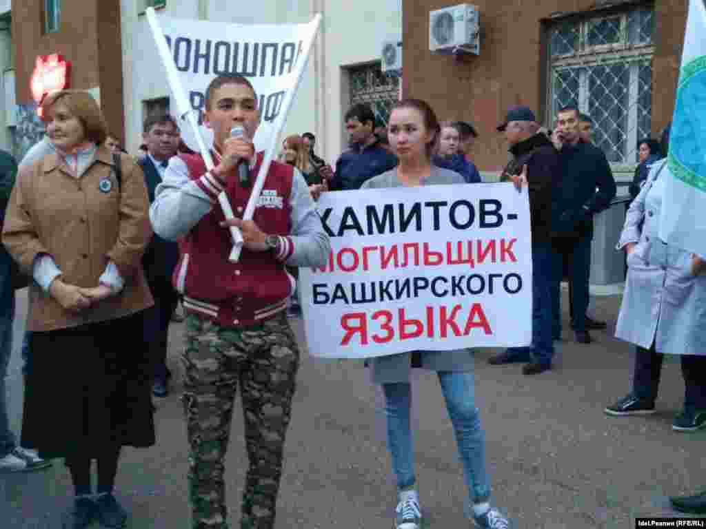 Власти Башкортостана не согласовали митинг за отставку главы республики Рустэма Хамитова, который прошел в Уфе 21 сентября. Полиция предупредила, что организаторы и активные участники могут быть привлечены к ответственности. Полиция в начале акции еще раз напомнила о несогласованности митинга, потребовала убрать плакаты и мегафоны. Митингующие не подчинились. На митинг пришло более 500 человек, сообщает корреспондент "Idel.Реалии" с места события. В конце митинга полиция оформила протокол на организатора — журналиста Рамиля Рахматова. В выходные митинг в защиту башкирского языка в Уфе собрал несколько тысяч человек.