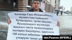 "Требуем создания музея и памятника Исхаки в Казани. Ремонта музея Исхаки в его родной деревне Яуширма. А также масштабного проведения юбилея Исхаки" — с таким лозунгом Агзамов сегодня вышел на пикет к зданию кабинета министров Татарстана.