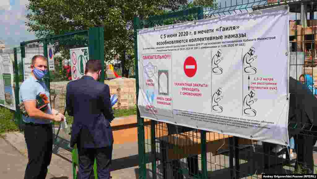 Теперь их посещение разрешено — но только в масках и перчатках, кроме того, необходимо соблюдать социальную дистанцию. Корреспондент "Idel.Реалии" побывал на первом пятничном намазе в казанской мечети "Гаилә". Эта мечеть расположена в микрорайоне "Азино", где плотность населения очень высокая, потому обычно пятничные намазы здесь собирали одновременно порядка 700 прихожан (как внутри здания, так и во дворе) — однако в эту пятницу, 5 июня, мечеть смогла принять лишь около 200 человек. Во дворе и внутри мечети нанесли специальную разметку — полоски, рядом с которыми надлежало класть молельные коврики.