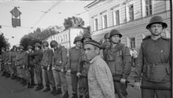 "Это первый раз, когда ОМОН приехал на площадь Свободы, где проходил очередной митинг. Здесь на переднем плане человек в тюбетейке, татарин, наверное. Руки у него сложены за спину. Такое ощущение, что ему сейчас наденут наручники. Он как бы приготовился к аресту. И за ним стоит длинная цепь ОМОНа. Здесь трамвайная линия на Карла Маркса как раз выходит. И когда пошла толпа со стороны площади Свободы, то начались беспорядки. И схватка с ОМОНом была. Люди бросались под трамвай — а их пытались оттуда за руки, за ноги извлекать".
