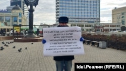 Сегодня, 20 ноября, в Казани, на площади перед часами на улице Баумана, прошел одиночный пикет лидера Всетатарского общественного центра (ВТОЦ) Фарита Закиева против ликвидации Конституционных судов субъектов России. Об этом сообщает корреспондент "Idel.Реалии" с места событий.