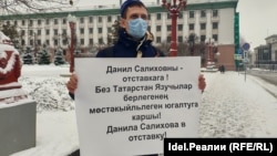 В Казани перед Министерством культуры РТ прошел одиночный пикет лидера Союза татарской молодежи "Азатлык" Наиля Набиуллина с требованием отставки председателя Союза писателей Татарстана Данила Салихова. Об этом сообщает корреспондент "Idel.Реалии" с места событий.