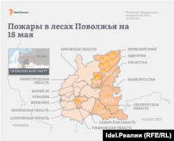 По данным Авиалесоохраны за 18 мая, на территории России "действовало 65 лесных пожаров на площади, пройденной огнем 23 234 га". Больше всего леса сгорело в Тюменской области — 22 310 га. Остальные почти тысяча га приходятся на другие регионы, в том числе поволжские. Из них на первом месте Пермский край. Там выгорело 86 гектаров леса. На втором Ульяновская область — 23 га. На третьем — Башкортостан, где огонь уже уничтожил 10 га леса. Еще 11 мая в Башкортостане крупных пожаров лесники не обнаружили, но часть территории республики уже заволокло смогом от пожаров, бушевавших на Урале и в Сибири.