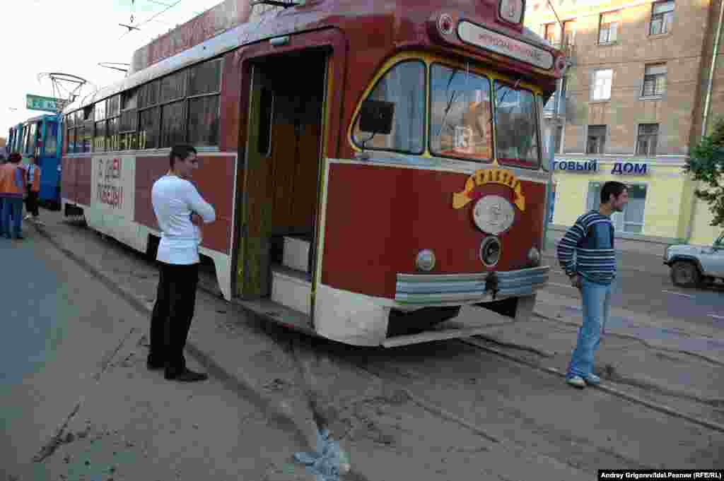 Трамвай-трактир "Пятёрочка" сошёл с рельс и перекрыл проезжую часть на улице Декабристов у остановки Гагарина. Июнь 2007 года.