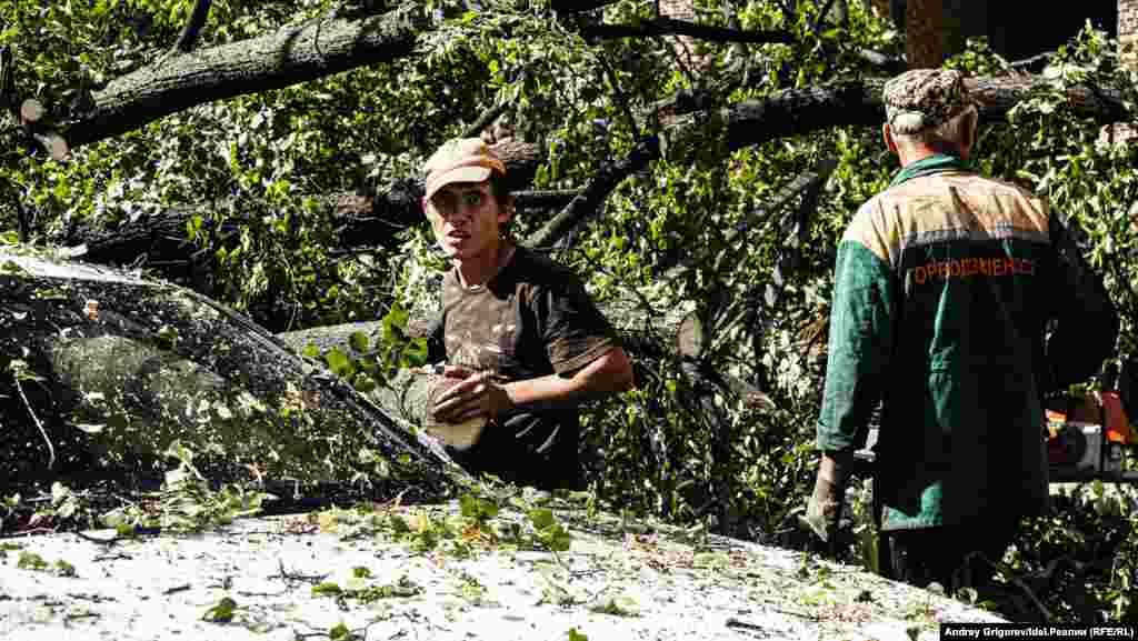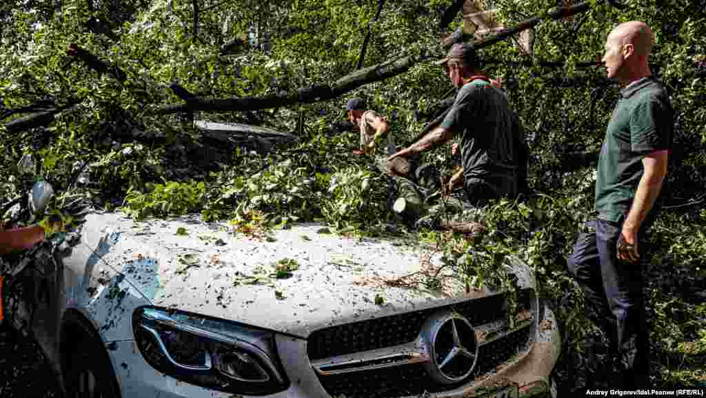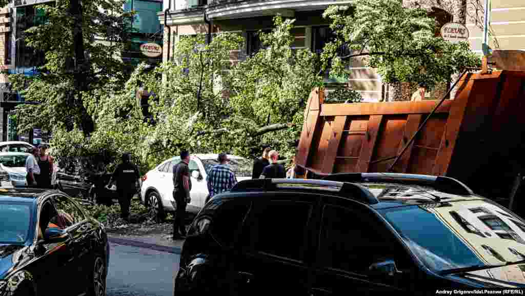 Свидетелем разбора завалов на фешенебельной улице Бассейная, спускающейся от Малой Красной к Пушкина мимо Верховного суда Татарстана, стал корреспондент "Idel.Реалии". Здесь дерево рухнуло сразу на несколько припаркованных у тротуара машин.