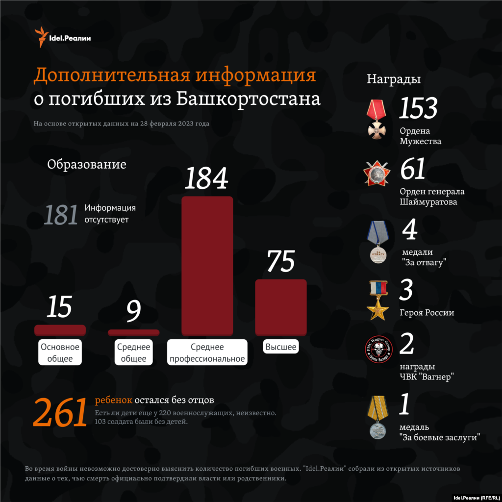 По подсчетам "Idel.Реалии" на конец февраля 2023 года на основе открытых данных, погибшими из Башкортостана на войне, которую Россия ведет в Украине, оказались 464 человека.