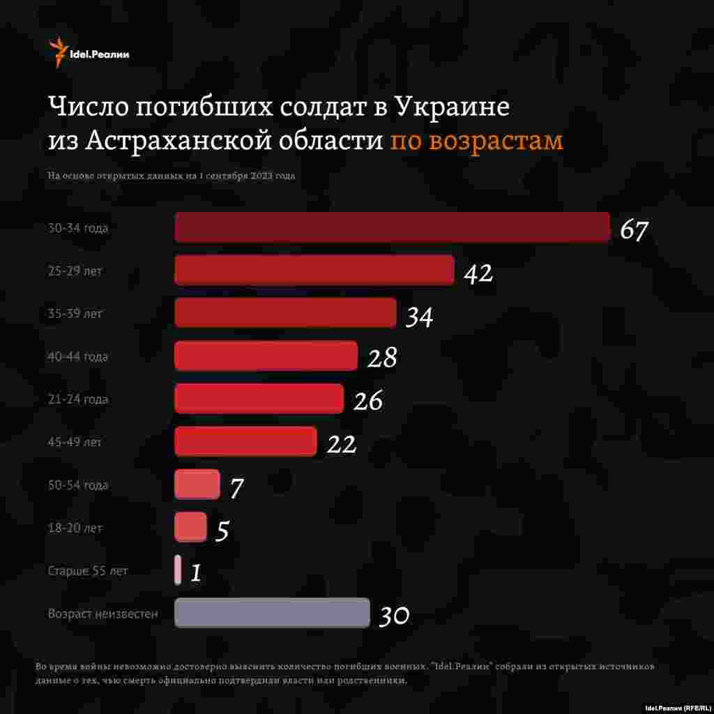 Как минимум 140 уроженцев Астраханской области в возрасте до 35 лет признаны погибшими в Украине с начала войны. Из общего числа погибших 103 человека числились контрактниками — это те, кто находились в составе действующей армии страны на момент начала войны в Украине (24 февраля 2022 года) или подписали официальный контракт с Министерством обороны России уже после ее начала. Они служили в регулярной армии. Еще 53 человека были наемниками (47 из них служили в ЧВК "Вагнер"); 33 — мобилизованными; 16 — добровольцами.