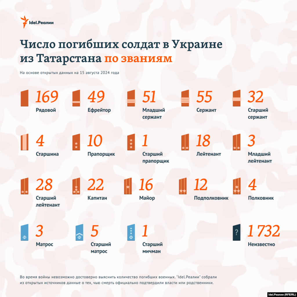 "Idel.Реалии" собрали всю известную на данный момент информацию о погибших на войне уроженцах Татарстана — возраст, звания, районы, образование, дети, медали и др. Всего, по данным на 15 августа 2024 года, погибшими признаны как минимум 2 215 человек из Татарстана.